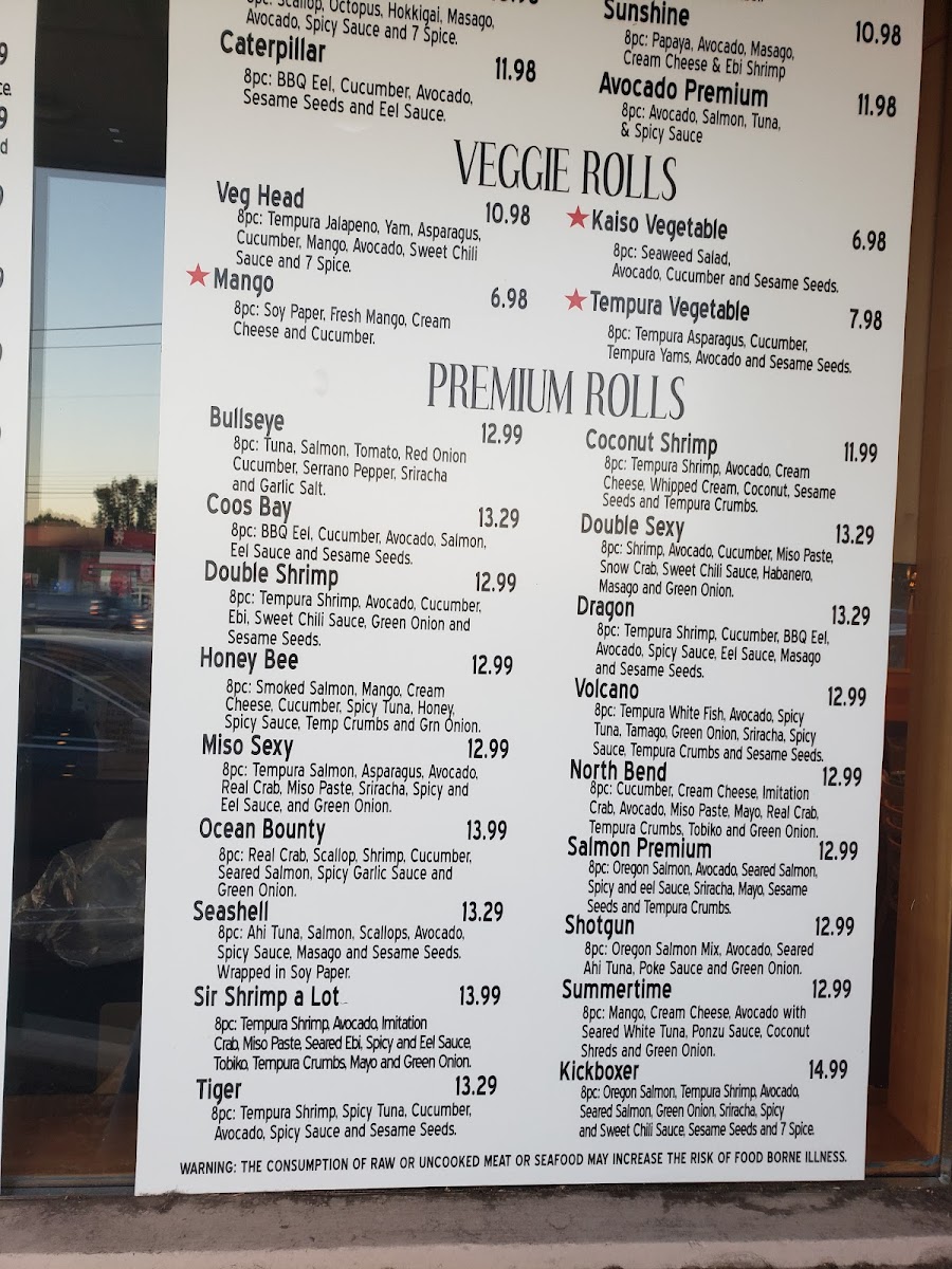 12 pieces. Oregon Salmon, Avocado, Tabiko, Masago, Spicy Sauce, Eel Sauce, Mayo, Sriracha, Sesame Seeds, Green Onion, 7-Spice. Tempura Fried.